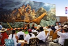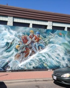 Unveiling day was a major event, the town closed the road, TV cameras showed up to tape it for broadcast, seniors centre and old folks homes brought in the seniors on a bus that was donated for the event. Local businesses provided refreshments. Young people from the local youth club were on the roof of the building to pull up the tarps when ready, youth from the local First Nations community were out dance a blessing with the support of a huge honor drum and drummers.